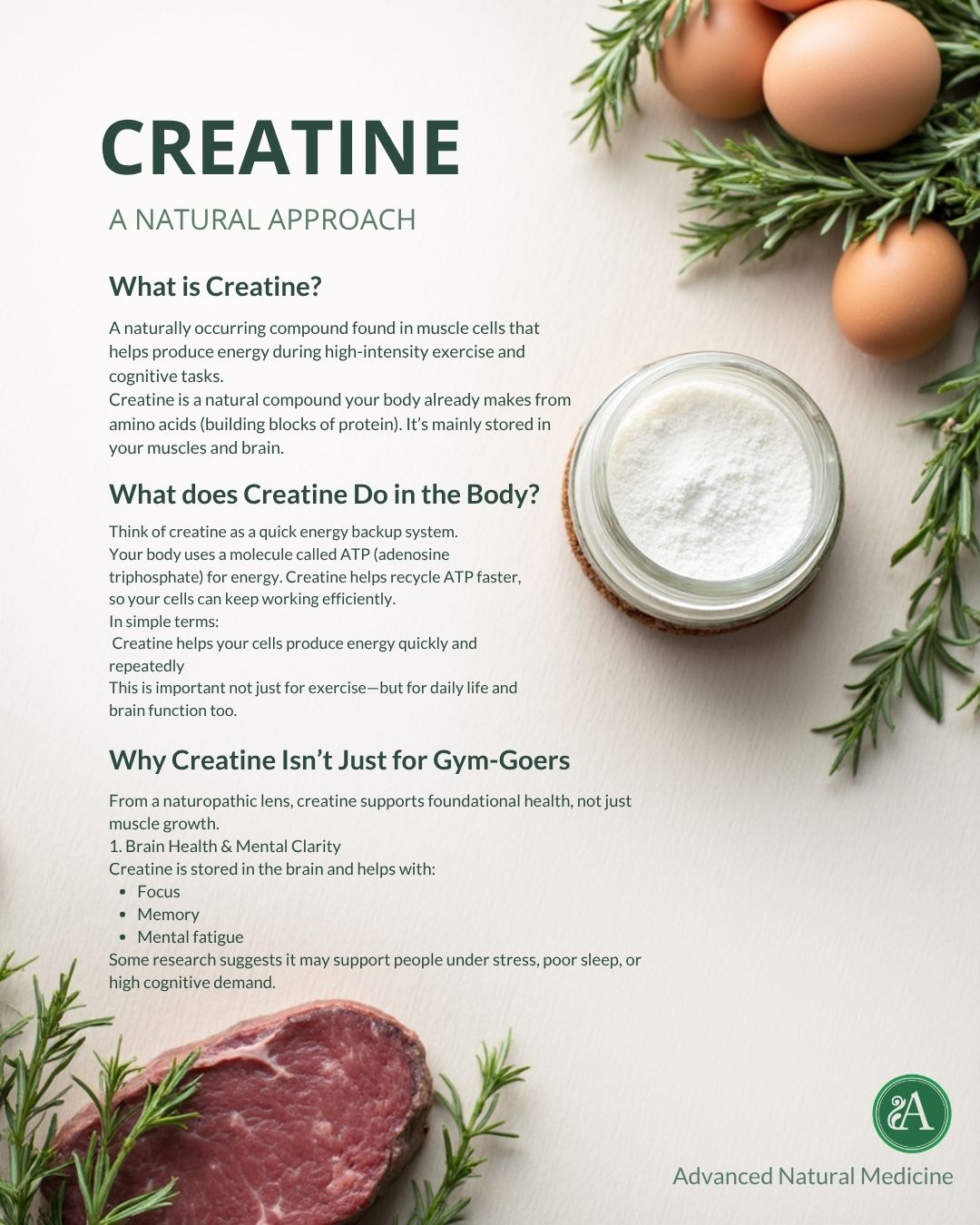 Rather than seeing creatine as a “performance enhancer,” naturopathy views it as a foundational nutrient that supports: